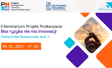 W imieniu PMI PC Oddział Podkarpacie serdecznie zapraszamy wszystkich sympatyków na II Seminarium z cyklu Projekt Podkarpacie. Spotkanie odbędzie się pod hasłem: "Bez ryzyka nie ma innowacji".